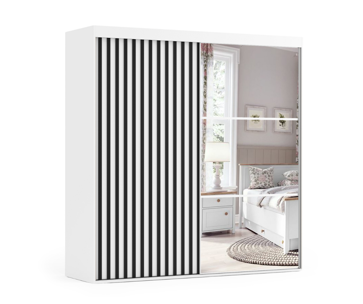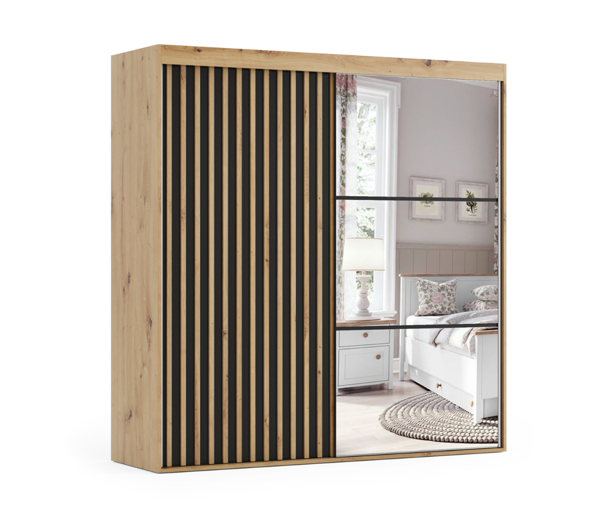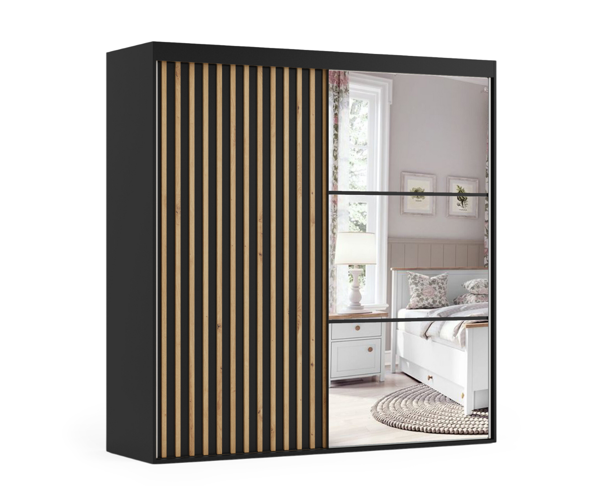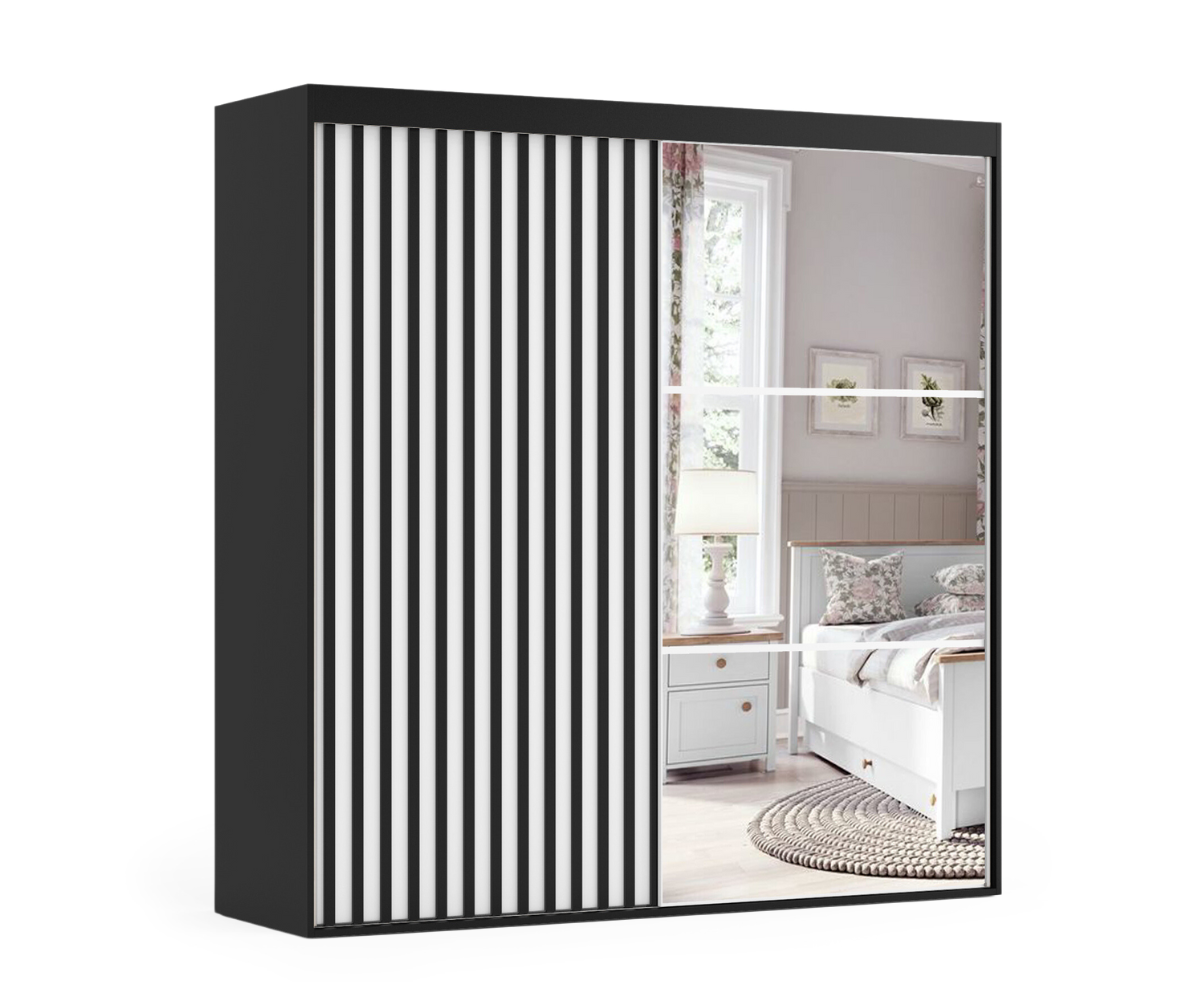 Wygoda, styl, funkcjonalność – tym cechuje się szafa Elsa, która doda uroku twojemu wnętrzu. Występuje w 4 wariantach kolorystycznych, a także jest wykonywana na wymiar. Szafa wyposażona jest w lustro po jednej stronie drzwi. Dodatkowym atutem są lamele znajdujące się na froncie drzwi. Szafa posiada drzwi przesuwne po obu stronach. Na naszej stronie są dostępne wszystkie wymiary szafy. Wykonana jest z płyty wiórowej o grubości 18 mm.